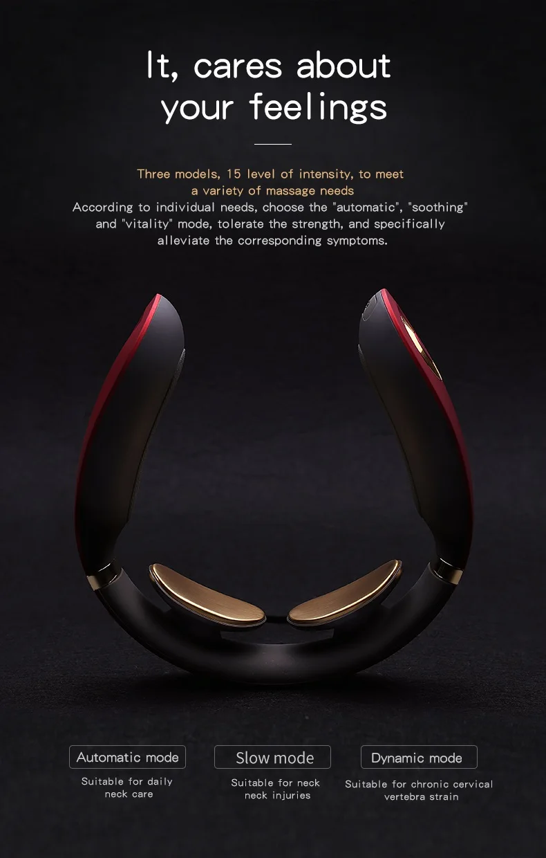 1. THREE MODELS, 15 LEVEL INTENSITY A variety of massage strength options, targeted to deal with your neck 3MODES 15LEVELS Automatic Mode - Suitable for daily neck care Slow Mode- Suitable for neck injury Dynamic Mode- Suitable for chronic cervical vertebra strain.